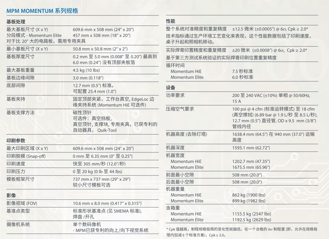 Momentum 被设计和打造成一款实用的生产设备,低成本高效率,占地面积适中,可随用户需求而变化,当用户要求增加产量时,可添加创新的专利功能或者根据需求重 新配置。基于不同的循环时间速度或者功能需求,Momentum 有 5 种不同的型号。Momentum 受大量专利的保护,包括正在试用和实际使用的系统及其他成功的、设MPM Momentum 系列为满计早于Momentum印刷机 (目前仍在使用中) 的 MPM 专利特点。Momentum 的对准重 复