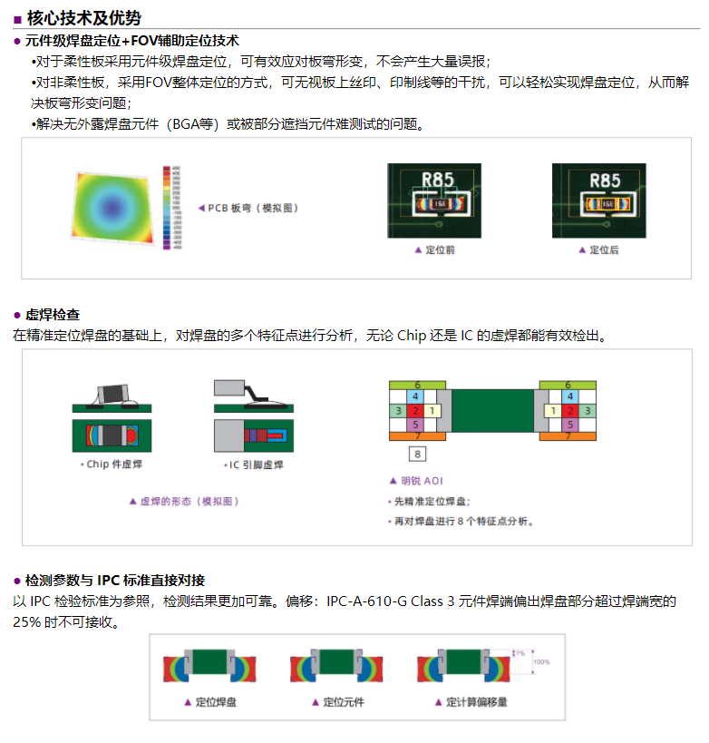 明锐理想的V5300系列双面检查AOI适用于双面电路板的在线检查;配备上、下双相机,无需翻板,即可实现双面检查;防尘保护,自动除尘;算法逻辑功能强大,适应于异型元件检查;板弯自动补偿,应对电路板的高温变形;波峰焊专用算法,应对插件各种不良。