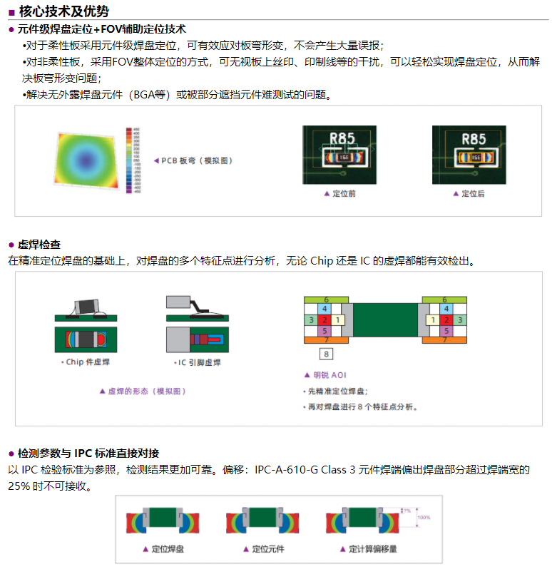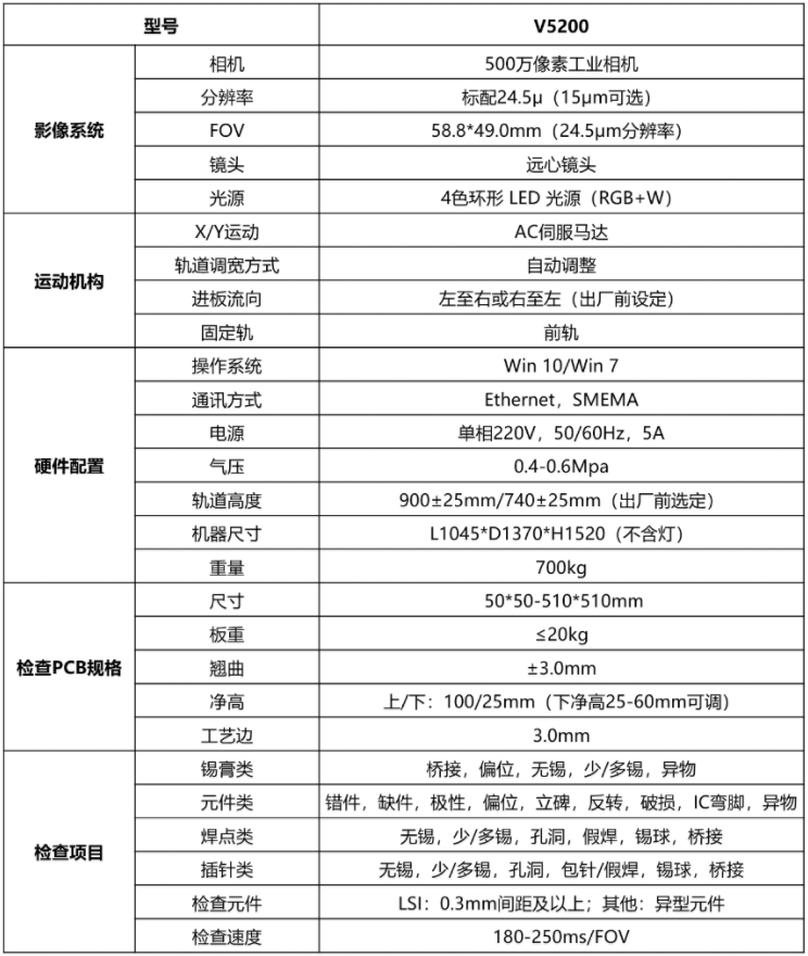 明锐理想的V5200下照式在线AOI可用于波峰焊及回流焊电路板的在线检查;其相机置于轨道下方,无需翻板;防尘保护,自动除尘;采用光纤传感器,具有掉板提醒功能;滚轮传动,应对电路板的超重、高温;算法逻辑功能强大,适应于异型元件检查;板弯自动补偿,应对电路板的高温变形;波峰焊专用算法,应对插件各种不良。
