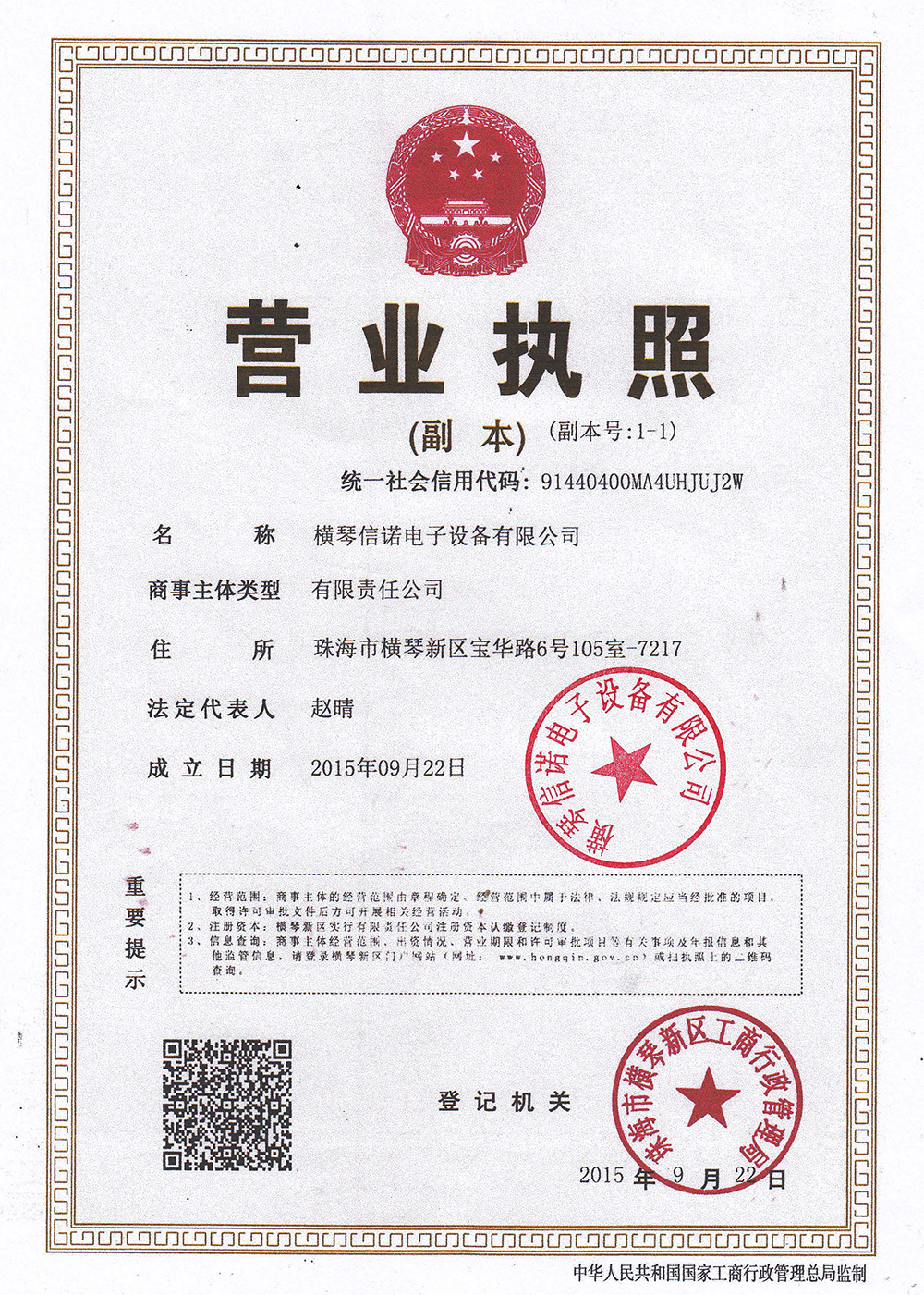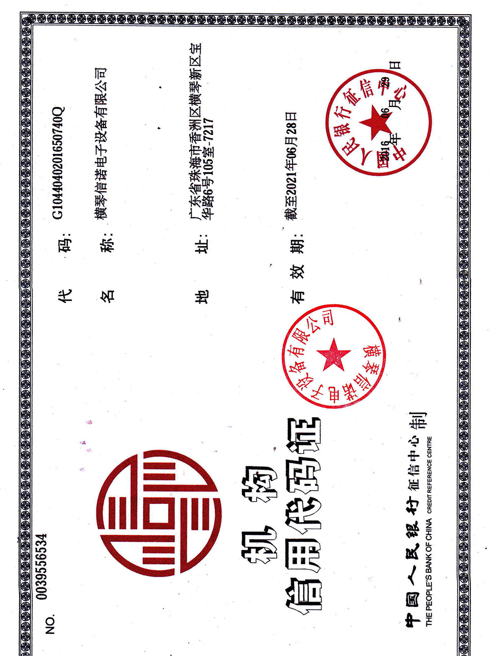 横琴信诺-信用代码证